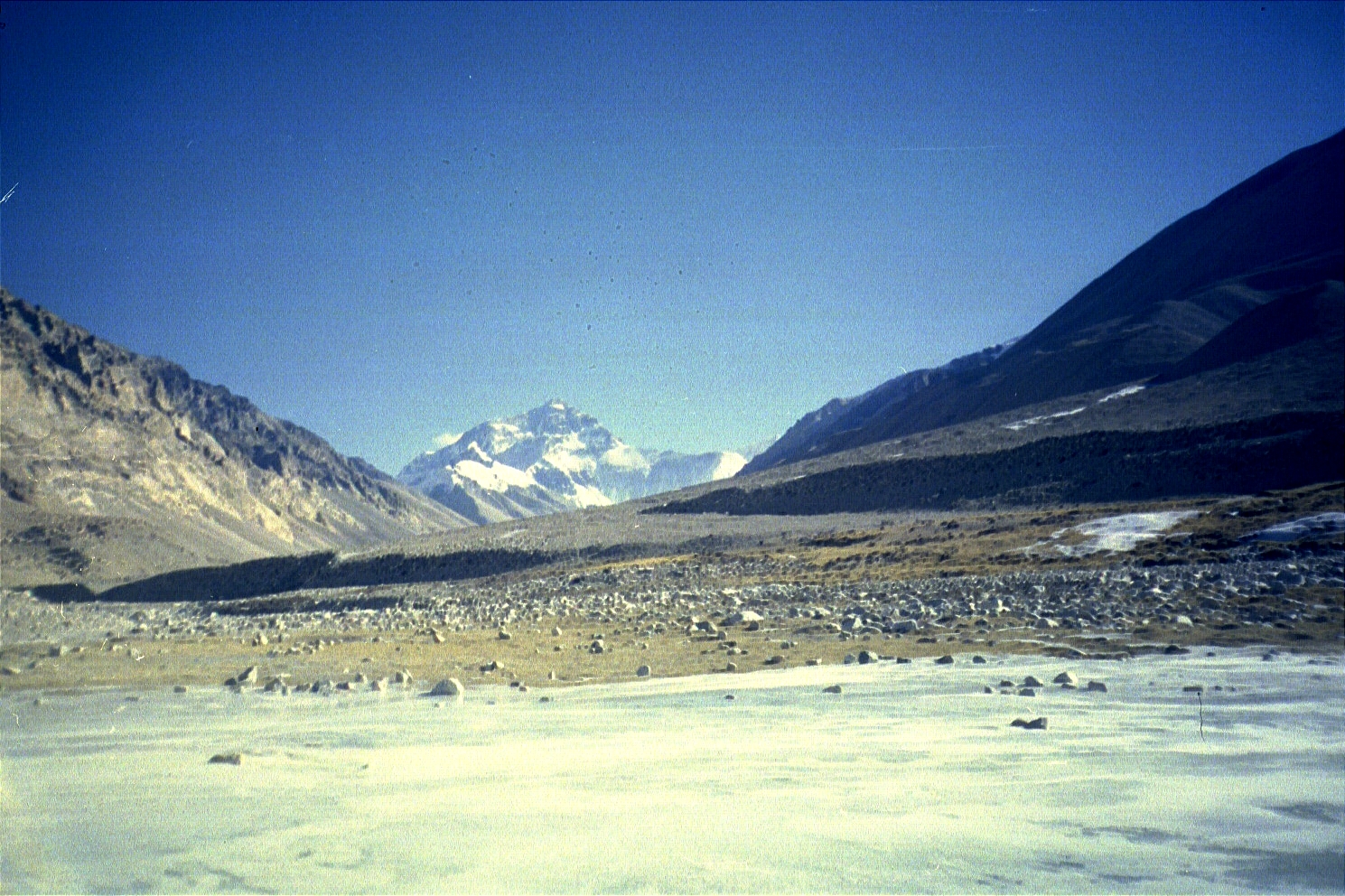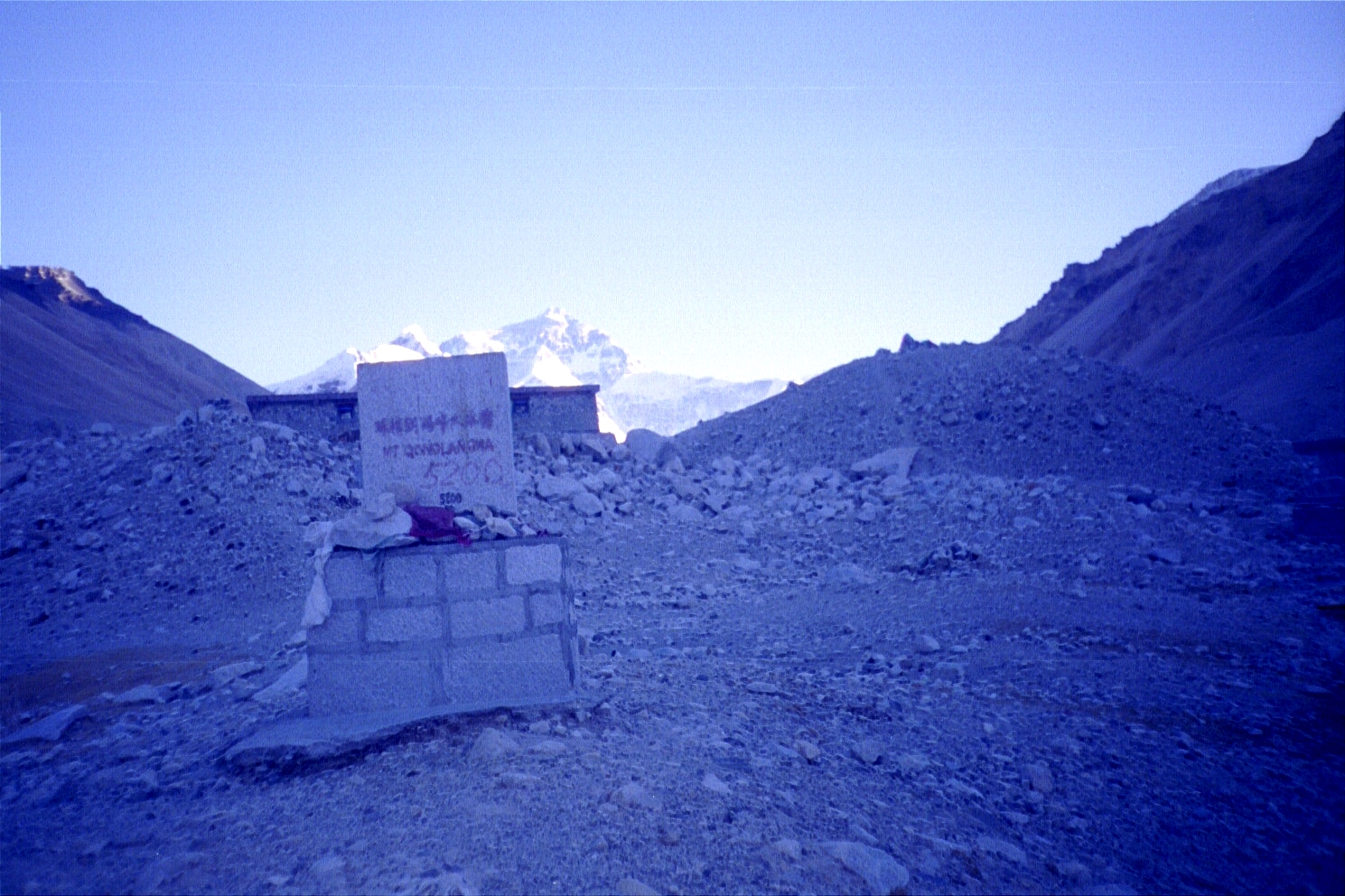 By the time we hit a sheet of ice (on a ridge) that the car couldn't go through, it was approximately around 4p. We then decided to walk the next ten or so miles (starting at an elevation of 5000 metres/16500 feet) to the base camp marker. The sun was out and it was fairly decent going, but the altitude was definitely taking its toll (especially since we were going all out to make it before the sunset). The view of Everest was a great motivator! Finally, we reached the base camp marker at 5200 metres/17160 feet around 730p, exhausted and exhilarated.
